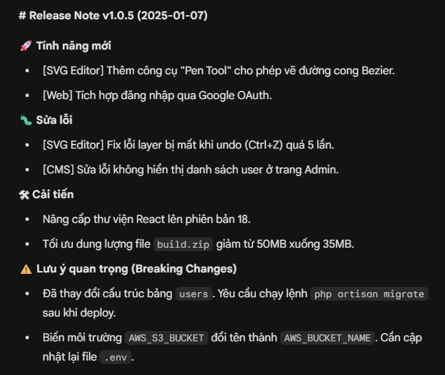 • Breaking Changes (rất quan trọng cho Dev): Những thay đổi làm code cũ không chạy được hoặc cần thao tác thủ công (Ví dụ: API /user/info đổi thành /user/profile. Cần chạy lại migration database)