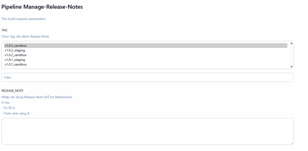 Tại trang Jenkins của Octokit, sẽ có job tên “Manage-Release-Notes”, truy cập vào job -> Build with Parameters. Tại đây ta sẽ thấy trang quản lý Release Note như bên dưới