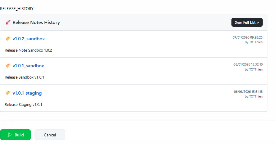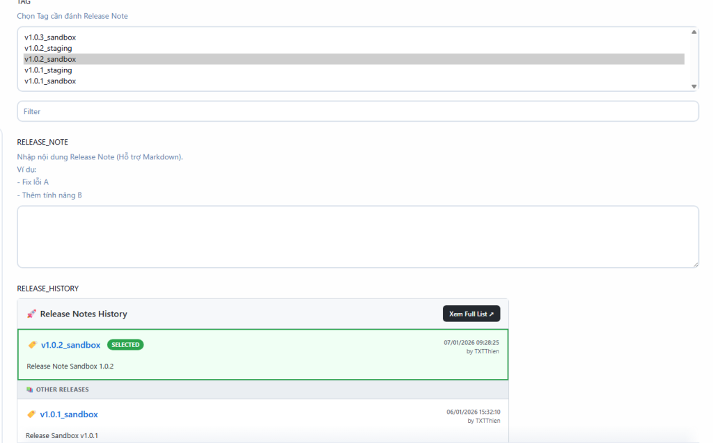 Tag sẽ hiển thị danh sách toàn bộ tag giống với rollback, mục đích là hỗ trợ việc đánh Release Note. Release History sẽ hiển thị danh sách 100 Release Note gần nhất của dự án. Khi bấm vào 1 tag, hệ thống sẽ tìm Release Note của tag đó và hiển thị nổi bật lên, nếu không có sẽ báo không tìm thấy. Nếu release note quá cũ (>100) thì cần phải vào Git xem, do giới hạn API Git chỉ trả về 100 release note.